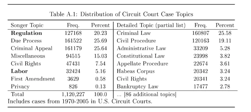 美国联邦法院制度分为三个层级:地方层级 (地区法院)、中级层级 (巡回法院) 和国家层级 (最高法院)。文章从彭博法律搜集了美国上诉巡回法院在 1970 年至 2005 年间的案件判决,并与singer数据库、联邦司法中心数据集、LexisNexis数据集进行交叉核对。数据包含了法官信息(性别、信仰、宗族、学位、工作经历等)。案件数据中,20%与监管相关、5%与劳动相关。