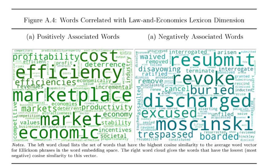 文章使用“词嵌入“的方法识别判决经济风格。具体方法为将法官书面意见去掉大写和标点符号,储存为词语列表进行预处理。将词语列表与法律经济词汇数据库联系。由于包含特定经济词汇的案件占比较低,难以直接用词汇频方法计算,因此更换为语境相似度进行测度。