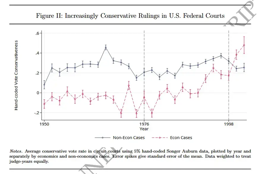 保守主义司法:基于案件法律诉求进行手动编码(样本占比5%),态度分为自由主义、保守主义、中立或难以编码。图片显示保守主义呈上升趋势。