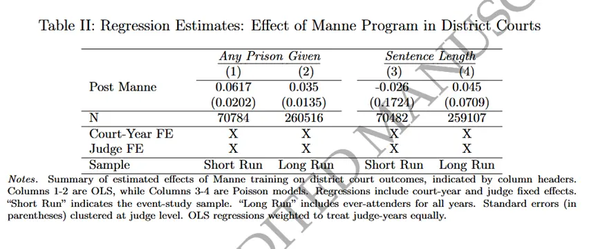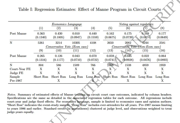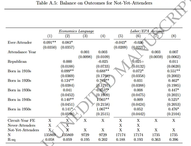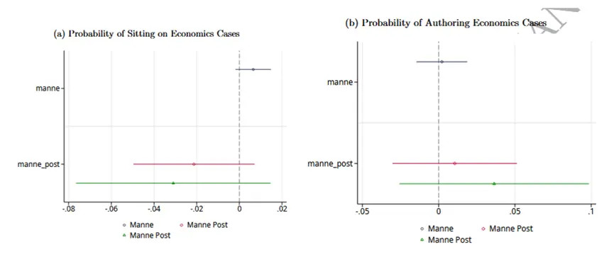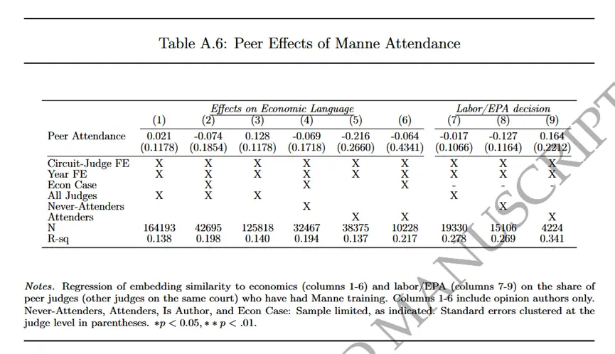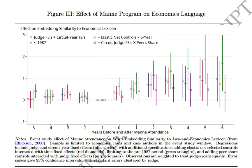结果表明参加曼恩项目的法官倾向于在书面司法意见中增加使用经济学相关词汇。文章使用法学词汇相关性替代经济学词汇相关性进行检验,结果并不显著。