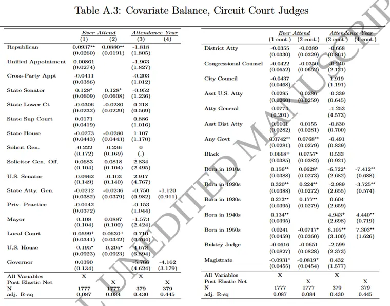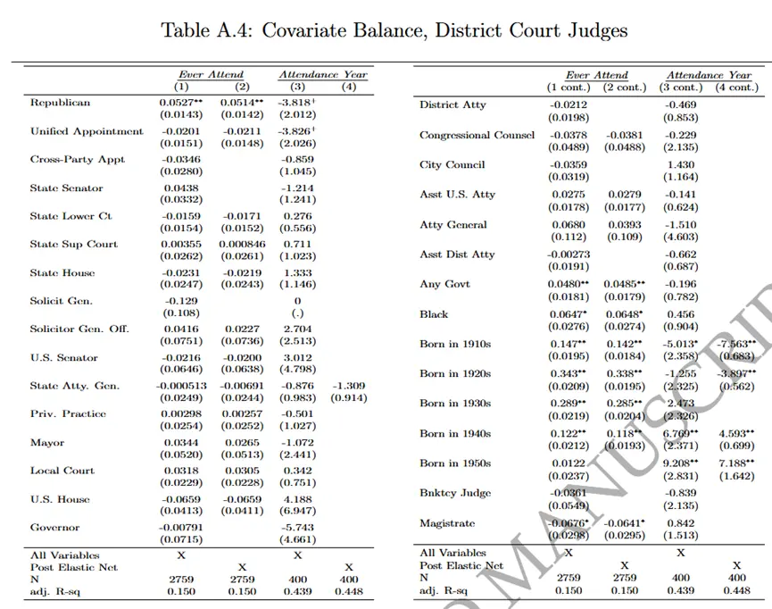 由于培训名额先到先得,文章使用渐进did的方法进行估计。此时需要额外检验法院是否随机分配案件、先参加培训的法官和后参加培训的法官是否存在差异。美国法院案件由计算机实施随机分配,并确保法官小组不会连续重复组队。图片显示参加了曼恩计划和未参加曼恩计划的基层和巡回法院法官在经济案件类型分配上不存在统计显著性。