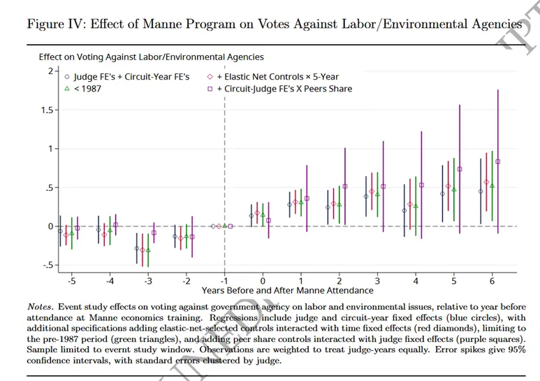 文章主要检验了法官对劳动、环境监管相关案件的投票意见。结果表明在经历培训后,法官更容易在监管议题上持反对意见。文章额外使用了反垄断法议题样本进行检验,结果虽然为正但并不满足统计性显著,可能是样本数量较少导致的。