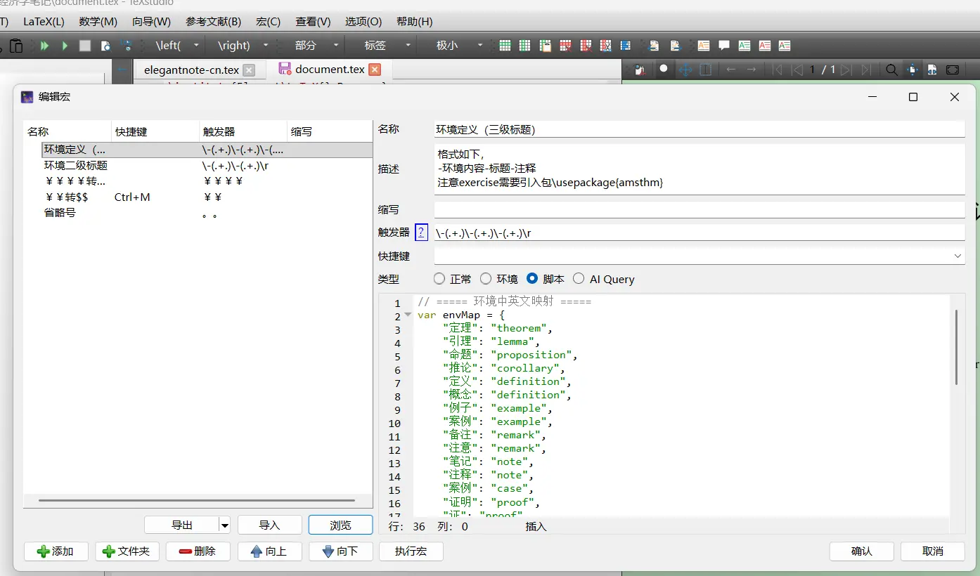 逻辑也不难,触发器三个括号的正则识别内容对应着代码里的 env 、title、label。填入构造代码模板,然后移动光标。(唯一问题是 texstudio 正则识别对中文符号的兼容太差了)